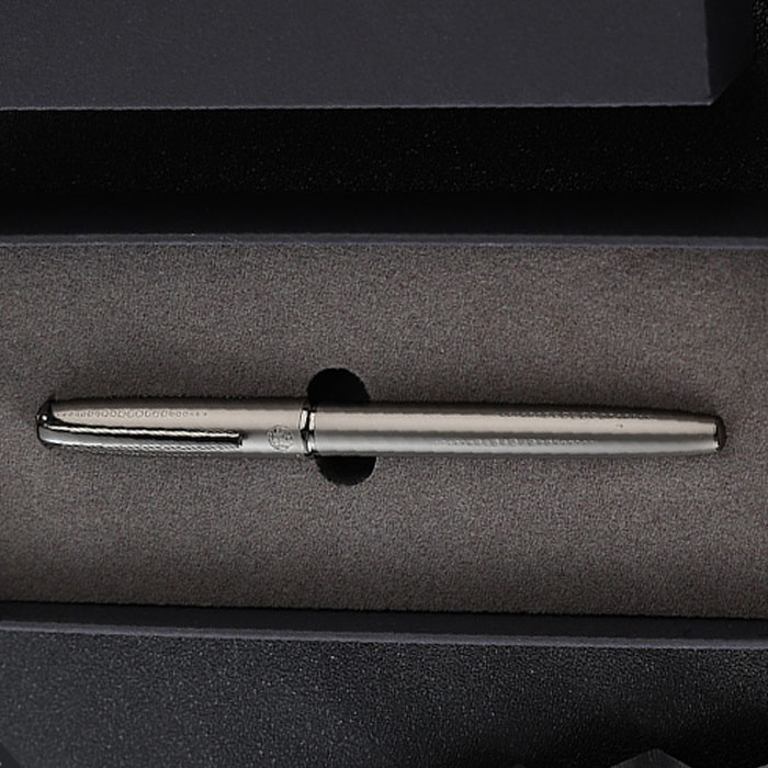 Phần tỳ bút được màu xám sáng bóng, logo thương hiệu được mạ vàng khắc chìm trên nắp và tỳ bút thể hiện đẳng cấp thương hiệu.